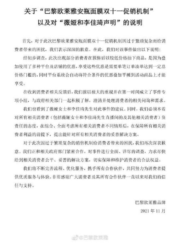 关于“巴黎欧莱雅安瓶面膜双十一促销机制”以及对“薇娅和李佳琦声明”的说明