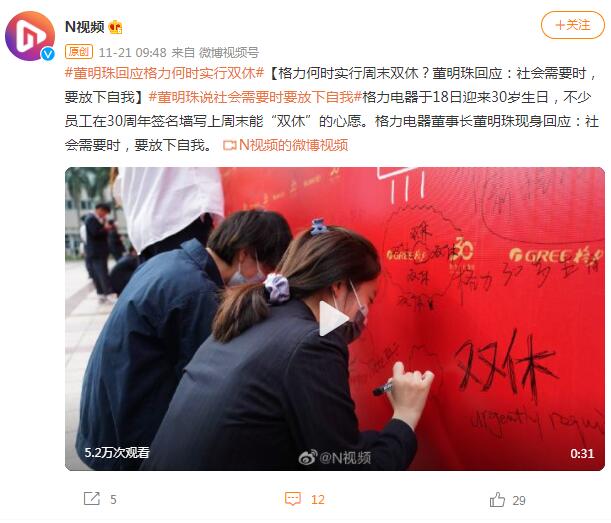 对于格力什么时候能实行双休的问题,董明珠回应称,希望一年里格力电器最好都是日班,没有夜班,但是当社会需要我们的时候,我们还是要放下自我。